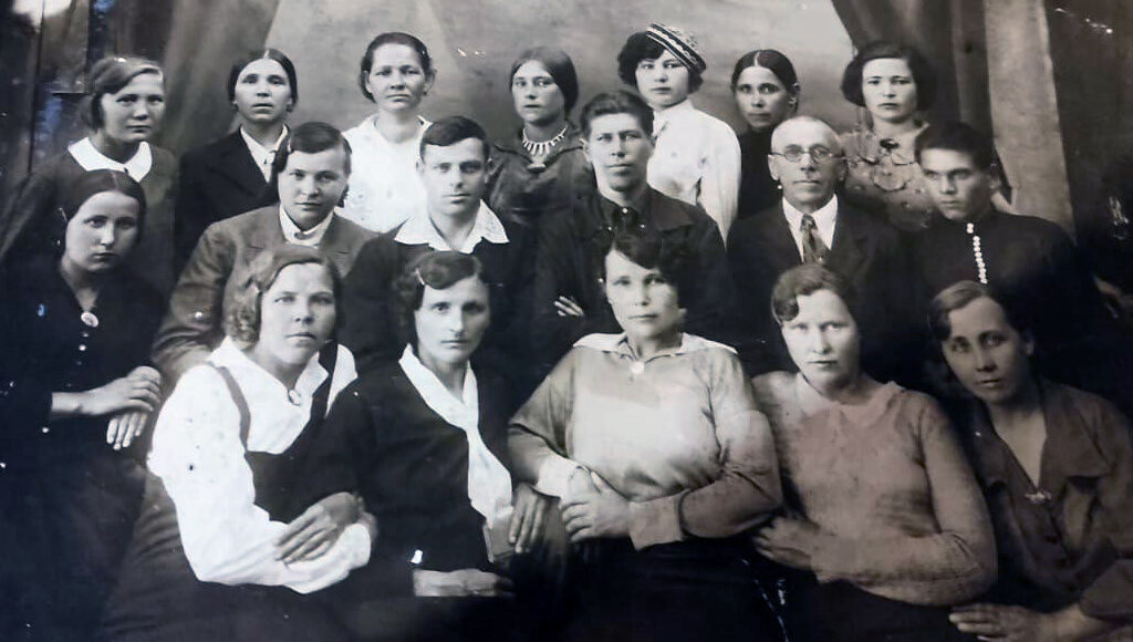 2-я стахановская бригада брезентального цеха льнокомбината им. Ленина. Евдокия вторая слева в нижнем ряду. Казань, 1938 год