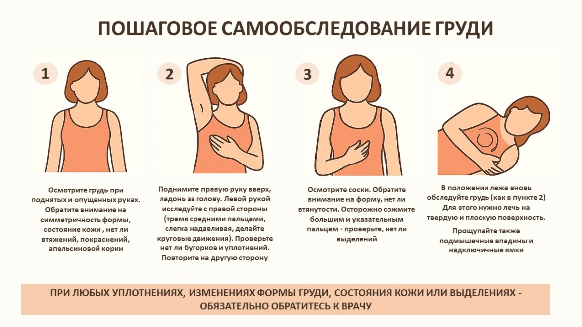 Регулярное самообследование помогает женщине лучше узнать свое тело, быть внимательнее к его изменениям и своевременно обратиться к врачу в случае подозрительных симптомов. Это особенно важно, так как многие злокачественные образования на ранних стадиях могут не вызывать боли или других выраженных симптомов.