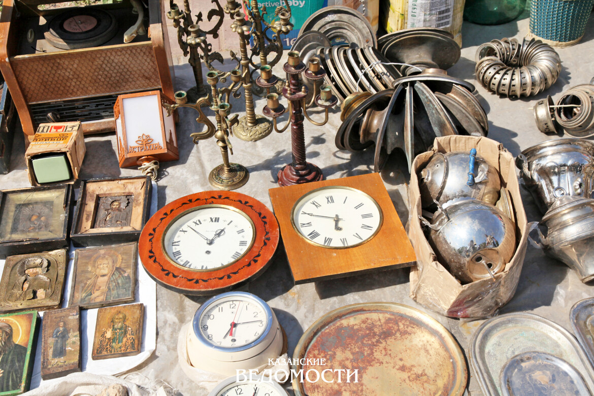 Очень много на рынке в продаже наручных и карманных часов, в том числе и антиквариат. А вот секундомеров практически нет. Когда в часовой мастерской менял батарейку, увидел секундомер советского производства по цене 4 тысячи рублей. Дороги статуэтки и новые, и антикварные. Умельцы выставляют на продажу изделия из дерева, художники - свои картины. Вообще, чем только не торгуют. Самовары, старые телевизоры, ножи, топоры, кухонная посуда... Всего и не перечислишь.